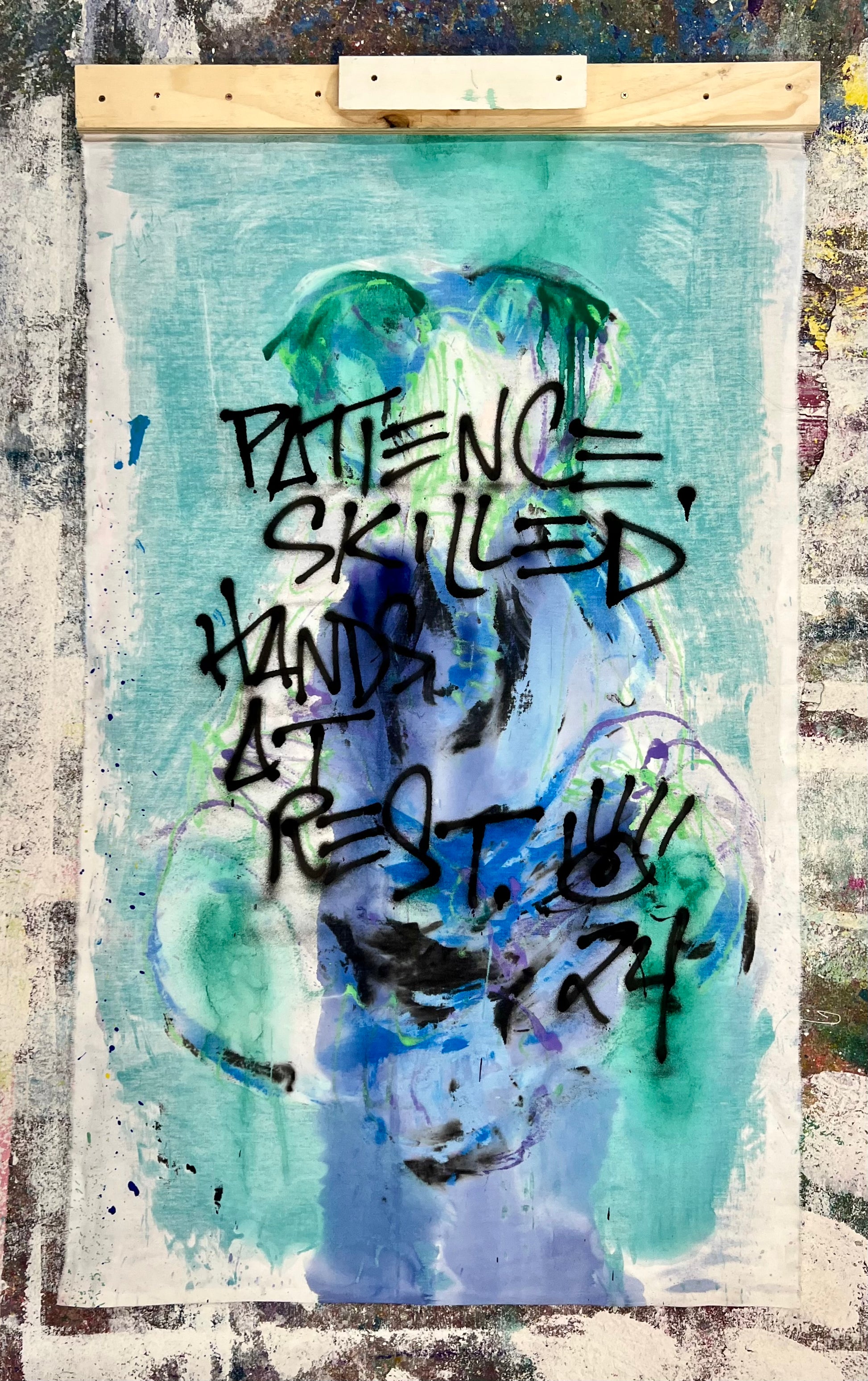 36” x 60” inches on unstretched canvas including wooden banner style hanging system